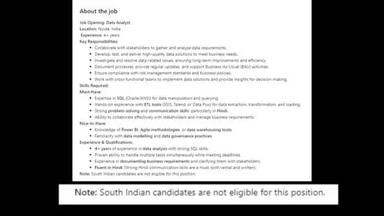 The unidentified company's job listing for a data analyst made it clear that "South Indian candidates are not eligible for this position," kicking up a storm on social media.